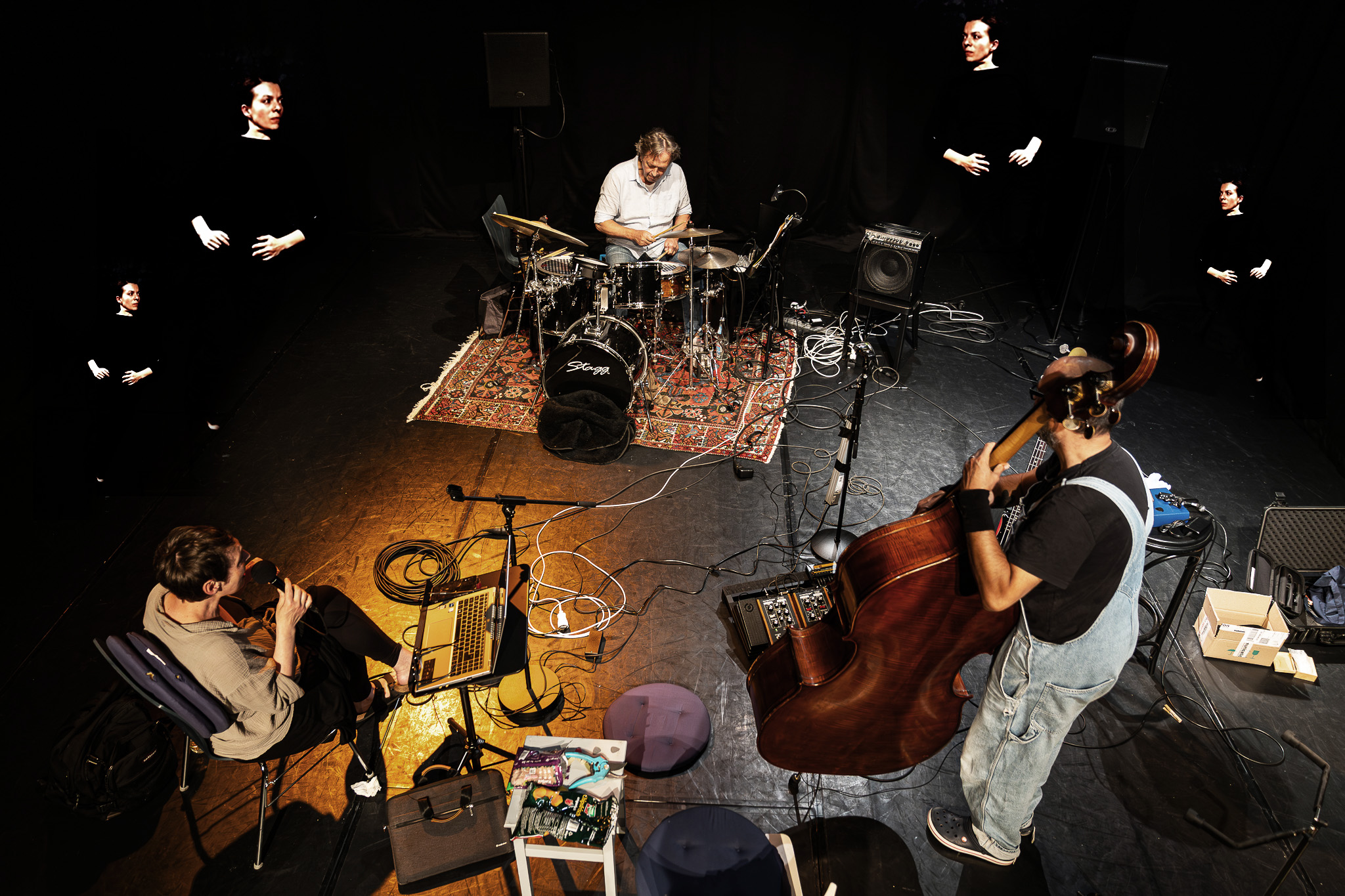 Auf Einladung von Indira Heidemann hatten die Musiker Karl Godejohann und Alex Quaet-Faslem in diesem Jahr Gelegenheit, gemeinsam mit der Tänzerin Melanie López López und dem Videografen Jörn Josiek im Rahmen einer durch den Fonds Darstellende Künste und Flausen+ geförderten Residenz einen offenen Arbeitsprozess zu gestalten, in dem sie der „Macht des Erzählens“ nachgehen konnten, denn: Der Mensch ist Mensch, wenn er erzählt: Unsere Identitäten und Biografien, historische Ereignisse, Gesellschaft und Politik werden durch unsere Gehirne erzeugt, die in narrativen Strukturen arbeiten. In der Residenz wurden diese Strukturen und Prinzipien künstlerisch erforscht und befragt. Irgendwie muss man dem Phänomen der immer schiefer werdenden Narrative in dieser Welt ja schließlich auf die Spur kommen…